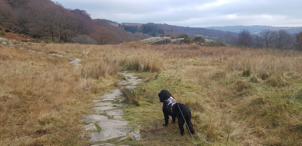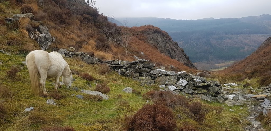 The area was beautiful that we were walking through. The only sounds that we heard was the tweeting of birds and the odd RAF fighter jet training, flying low through the hills. When we turned around to look at where we had started the walk the view would have been amazing on a less cloudy day. Even so, we could see Llynnau Mymbyr, the Snowdon range and Plas y Brenin spread before us. As we reached the col up a steady incline we came across four wild ponies grazing at the side of the track. I didn’t bark or even pull on my lead. We crested the col and the views on the other side of the hills opened up and were stunning. My dad said that this walk was becoming one of his favourites. We could see the rugged rocky Creigiau Gleision and Llyn Crafnant with it’s wooded surroundings in the valley. As we walked slowly down the rocky hillside I was allowed to run off lead for a while. My dad was a bit annoyed with me as I ran off chasing birds but I did return to him, eventually. It would have been slippery on this descent if it was raining as a lot of it was on grass. But, amazingly, it wasn’t raining and my dad managed to stay on his feet.