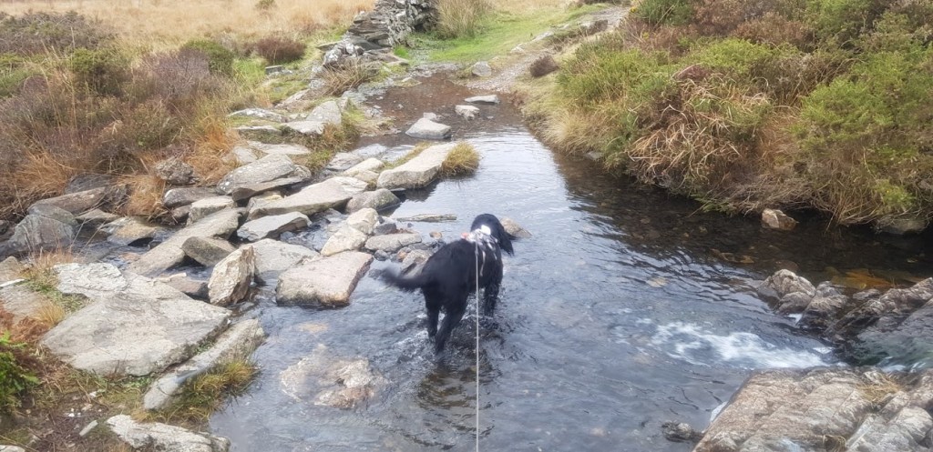 The hike started across the A5 opposite Joe Brown’s shop through a gate to a field. There were sheep in the field and I would have loved to chase them but I was on a retractable lead and I was being good anyway. We passed through a few gates that were erected next to ladder stiles. Luckily someone had placed gates there as the stiles are quite difficult for my dad to lift me over. The path was soon large rocks laid to prevent walkers sinking into the boggy ground. Soon the path became a rough stony trail with streams regularly crossing. I had a ball running in and out of the streams and puddles as usual. I was trying to chase birds again. This is my passion and I suppose that I will always do it. I know that it annoys my dad but, I’m sorry, I love it. I got overexcited and started to try to chase sheep again. I was doing, what my dad calls, my girly bark. It is a bit high pitched. Well, it’s a lot high pitched really. So, I was told off and made to walk to heel for a while because I was pulling on my lead again. I was thinking about asking my dad for subscriptions to British Birds and Sheep! Magazines for Christmas. They are more my cup of tea than his Trail magazine.