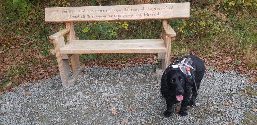 As we reached the bottom of the hill we turned left and passed a few buildings before we walked across a small footbridge over a fast rushing stream. We passed through a small coppice and a couple of fairly new kissing gates before we reached a bench. I asked my dad if he wanted to sit on it for a short break. I always stop at benches and look at my dad to see if he is ready for a rest. He sat on it for a few minutes while we both had a drink of water. The next section of the walk took us along a forestry track that followed the north western banks of the lake. Waterfalls could be seen on our left amongst the trees. It was an easy and pleasant walk. My dad let me run off the lead for a while as there was nobody around. At the end of the lake we crossed the outlet stream and turned left along a minor road. We passed the carpark and immediately joined a forestry track leading uphill on our right.