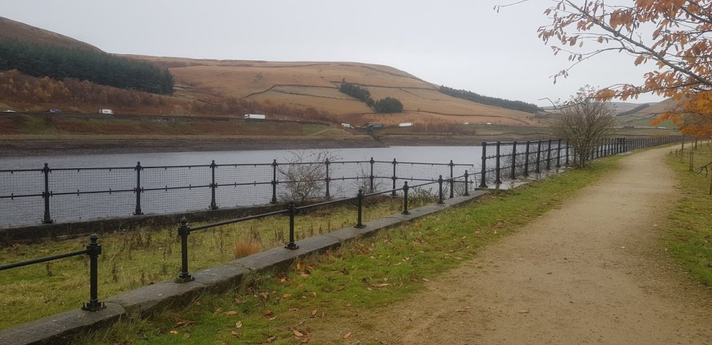 Sorry folks, back to the day’s hike. Due to the fact that my dad has been unwell for a while he decided to take us on another flat route. I suppose that it is good for our fitness levels. We need to keep getting some mileage under our belts because we are going to hike the Rob Roy Way in the new year. We both prefer to hike in the hills and mountains but we would rather do some flattish walks until the old feller gets a bit healthier. He holds me back so much but please don’t tell him! The day’s hike was to be along the Longendale Trail in Derbyshire. The weather wasn’t fantastic but it was forecast for showers rather than a full on stormy day like we seem to pick for our adventures. It is only just over an hour’s drive to Hadfield to the start of the trail. Hadfield is the setting for Royston Vasey in the TV series A League of Gentlemen. My dad says that he loves that programme and keeps calling me ‘Dave’ in a weird voice. I suppose that it means something to fans of the series. The route follows the disused Woodhead railway line that ran between Sheffield and Manchester. It is a multi-use path that hikers share with cyclists and horse riders. The gradient is gradual rising only 100 metres from end to end. It runs for 6.5 miles from the car park in Hadfield to the Woodhead Tunnel. Our plan was to do an out and back walk so it would be thirteen miles in total (my dad worked this out on a calculator).
