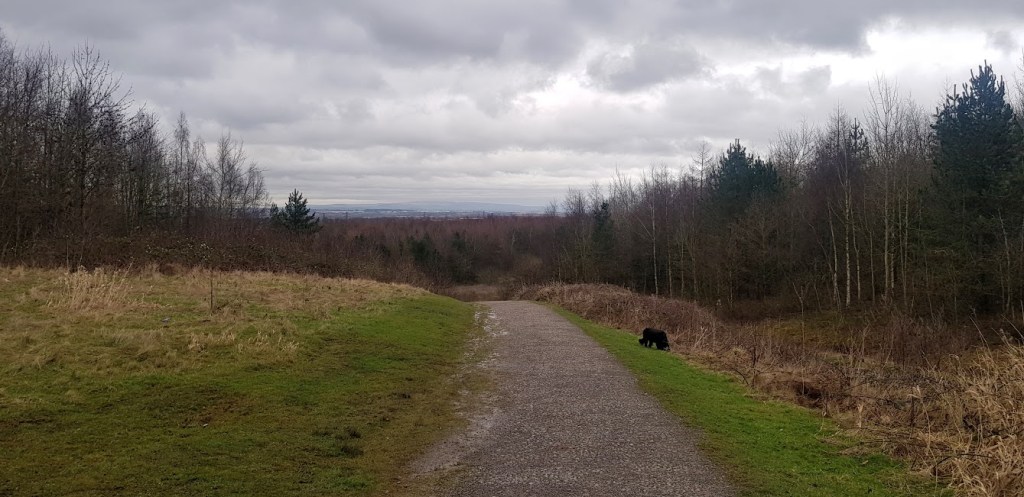 We moved on and criss-crossed the woodland park with it’s ponds and streams full from recent downpours. Extensive views across the near and distant country were granted through gaps in the trees. If you can ignore the noise of the traffic from the nearby motorway the hillsides can be quite peaceful. Runcorn’s three bridges over the Mersey can be clearly seen as can the eight towers of Fiddler’s Ferry power station. To the south Norton Water Tower, Daresbury Van der Graff generator tower and the towns of Runcorn and Widnes can be seen. The North Wales hills in the south west and Rivington and Winter Hill to the north are also visible. I found another one of my favourite things, a plastic drinks bottle. It is another of my obsessions that my dad scolds me for picking up. So, I had a quick chomp on it and then left it on the track when he told me off.