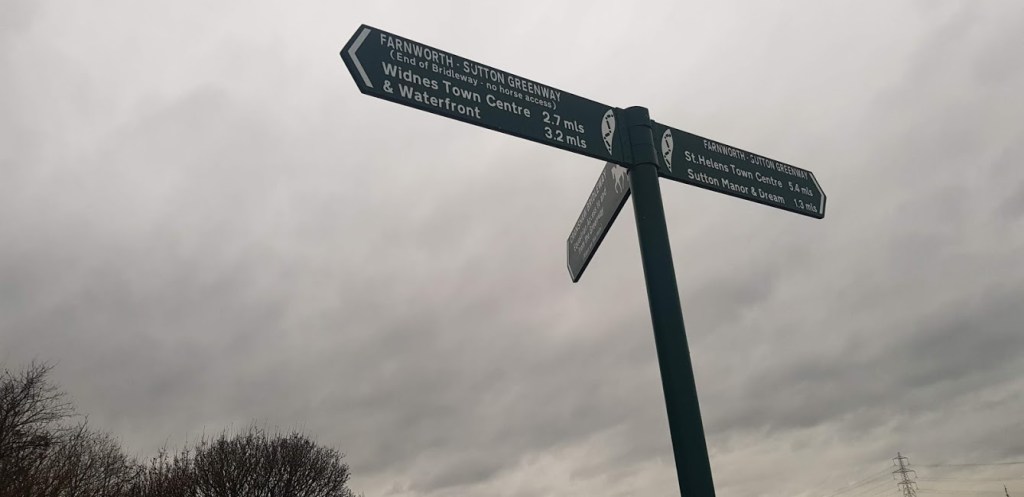 The Farnworth – Sutton Greenway follows a short length of the disused St. Helens and Runcorn Gap Railway that was constructed in 1830 to connect to the Liverpool – Manchester line from Runcorn. Carrying coal initially and later transporting cement, Ford cars and passengers until its closure in 1975. The surface is now compacted gravel and drains quite well with the mud only at the edges (which I found straight away!). The track initially, passes at the rear of a small housing development on the left with the previously mentioned garden centre on the right. After a couple of right-angled turns and through an ‘A-gate’ designed to slow/stop cyclists, the path opened up as a wide straight track disappearing into the distance.  The path is a multi-use route for cyclists, horse riders and walkers. I would assume that it is wheelchair friendly also assuming that a wheelchair could squeeze through the cycle traps. I imagine that this is the case. My dad only just managed to prise his ever- widening beam through the gate thanks to the unbelievable amount of unhealthy food he has eaten through the extended Christmas overindulgence.
