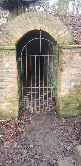 We left the lakeside and crossed the park road to head slightly uphill towards the perimeter fence and along a line of beech trees. We were gifted views above Melchett Mere as we approached the Ice House. This structure was built in 1856 to store ice taken from a pond next to the Mansion House. The ice was used to refrigerate food and could last for up to twelve months. We passed the Choragic Monument that sits at the head of the Mansion Garden Broad Walk. This folly is based on an ancient monument in Athens and provides a good viewpoint overlooking the parkland. I dragged my dad down the muddy grass slope towards the small lake and he yelled at me as he almost landed on his backside. So funny!