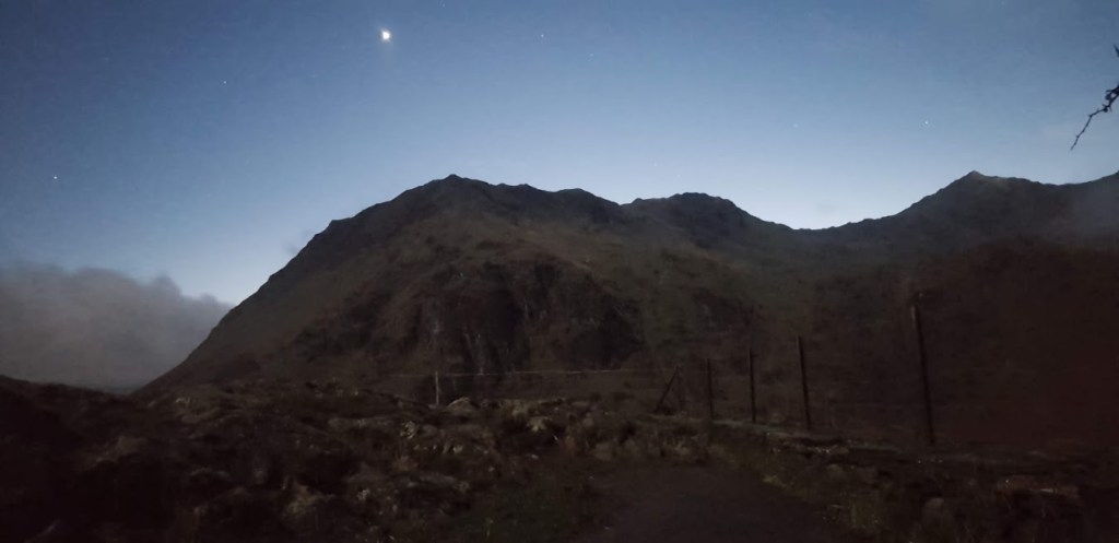 I had a short snooze as my dad drove us back to the campsite. The daylight was rapidly disappearing  and the temperature was dropping just as quickly. While I had a well deserved relax in the tent my dad made his Mac ‘n Cheese and coffee. I ate my food while his was rehydrating. Once we were full my dad tried to take a few photographs with his phone in the dark. He wasn’t 100% satisfied with the results but it was his first attempts. He decided to take a short drive up the A498 to the Snowdon Viewpoint to attempt some more shots. The view from this point of Yr Wyddfa, the Glyderau, Y Lliwedd, Pen Y Pass and Crib Goch are stunning in daylight but at night we couldn’t see a thing. He had a wee bit of success with his photography but he has a lot to learn. I sat in the car while he froze outside until, shivering, he jumped back into the car.