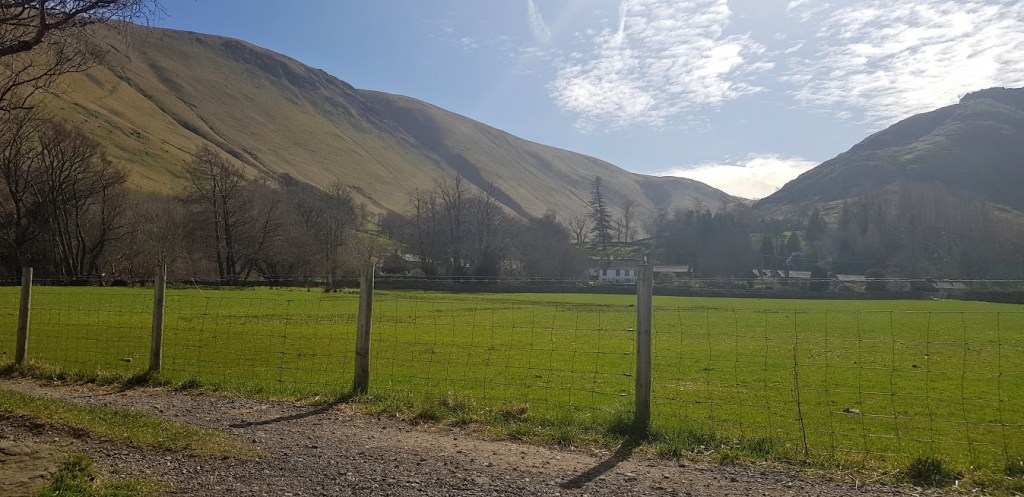 Once he appeared to be refreshed and rested, boots back on, we continued on our journey. We had taken our time on this hike, possibly due to the lakeside terrain or more likely the weight of my dad’s rucksack was slowing him down. It was late in the afternoon but, we were not in a rush. As we rounded Silver Point we were gifted with our first views of Glenridding, which was to be our overnight halt. It still appeared to be some distance away as we had to walk to the head of the lake and then onwards to the village. We could see Helvellyn in the distance towering above the lower lying fells. The lane passed through boggy land and across a bridge over Goldrill Beck before we reached the A592 leading into Patterdale. Patterdale and Glenridding were extensively filmed in the TV series The Lakes.