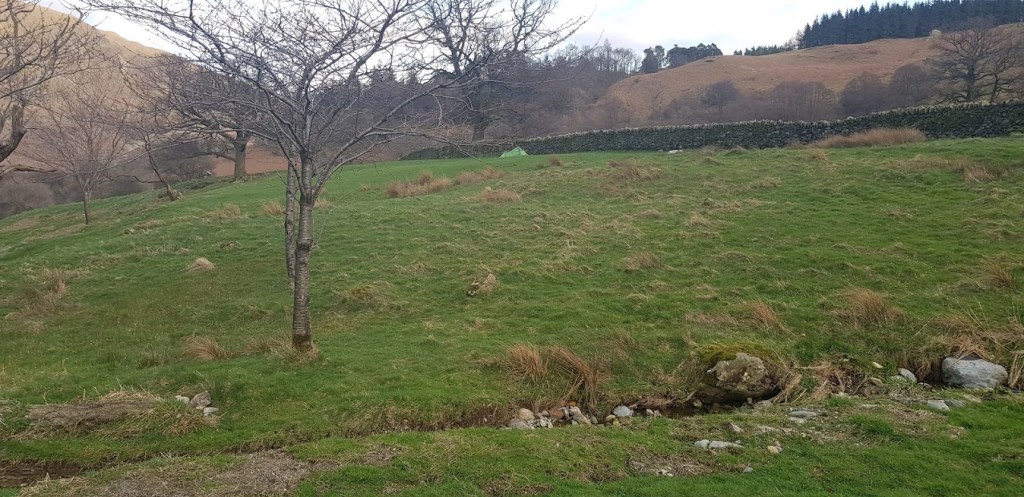 After a short lakeside stroll we arrived in Glenridding where we left the Ullswater Way to climb up the steep Greenside Road to Gillside Farm Campsite. This spacious, quiet campsite is close to Glenridding Beck with paths leading to Helvellyn. We found a suitably level pitch under a drystone wall. My dad cooked some food and made a coffee immediately after he pitched the tent. Then he left me to guard the tent while he went for a quick shower. By that time it was almost dark and the temperature was dropping rapidly.