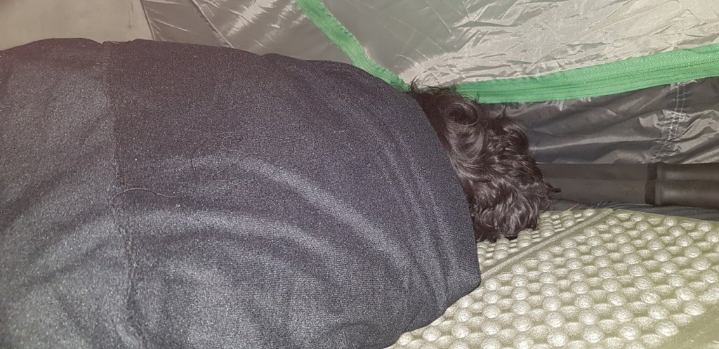 We decided to have an early night as the temperature dropped to near freezing. I think that we both slept really soundly that night after our exertions of the day. It hadn’t been a particularly long hike but, it was the big feller’s first time for a long while carrying a large and heavy rucksack. The weather had been kind to Joe the Cocker and his human and it had been a fun day but we were both tired. The walk had been about 13 miles according to my dads GPS and we had a similar distance to hike the next day so as we lay snuggled up in the tent, we pondered our first long distance trail, the West Highland Way, that we would soon be attempting. Till tomorrow folks!