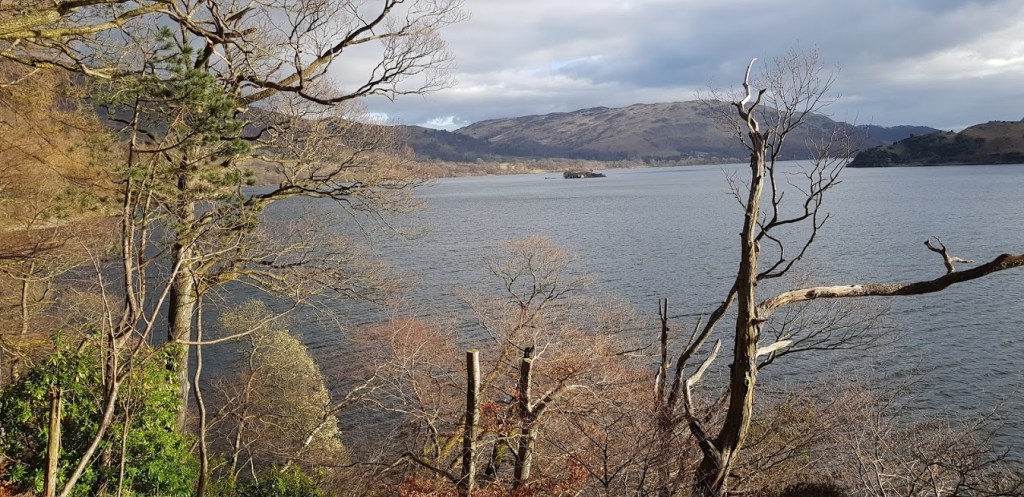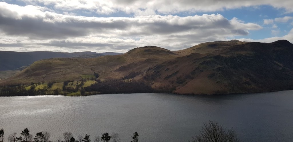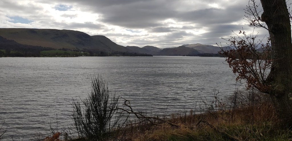 Firstly, we had to retrace our steps down the steep lane into Glenridding to rejoin the trail. The village was deserted with only a few cars rushing along the main road. We crossed to the lakeside path which followed the shoreline on the right with the road on our left. It was an easy start to the day as we frequently stopped to look across the lake where we had walked yesterday. The path led us through woodland until we crossed the road near to Glencoyne. This section took us through Glencoyne Deer Park where William Wordsworth was inspired to write his ‘I wandered lonely as a cloud’ poem after seeing ‘a host of golden daffodils’ by the lakeshore.