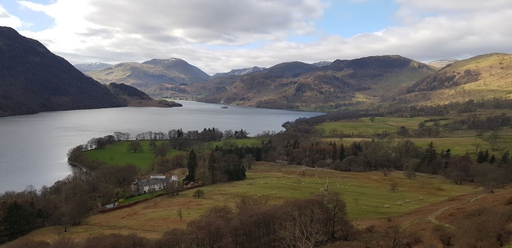 As we contoured Priests Crag the cold wind started to bite but the views made up for the discomfort. Once we had hiked the fellside section we came to long sections of fields and short sections of road walking. We passed Watermillock Church before we reached the small settlements of Bennethead and Wreay. At one point we had to cross a large field with grazing cows and a huge bull in it. I wanted to play with them but my dad made me walk close to him at a faster pace than he usually walks. I think that he was a bit concerned as the herd watched our every step. Maybe playing with the bull wasn’t the best idea that I have ever had.