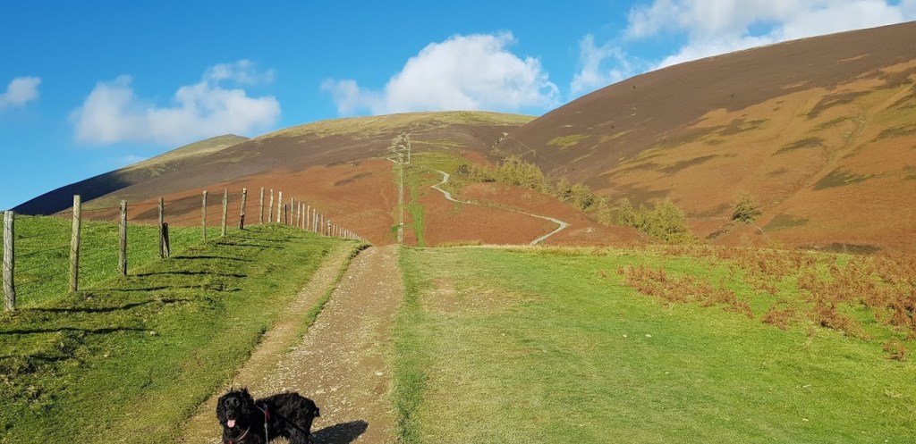 Hello people and pooches. Back in October 2018 I was one and a half years old and my dad had just started to take me hiking. I had built up my mileage steadily unto this time. I am difficult to tire out according to my dad. We had done plenty of flat walks during the summer with, latterly some larger and larger hills thrown in. We had failed on one attempt and then, on our second attempt, summited Snowdon recently. So, it was time for another adventure and another big hill. The Lake District had seen a light dusting of snow on the tops in the past few days so a trip to Skiddaw was planned for a sunny but chilly Monday morning. We didn’t set off to drive to the Latrigg carpark at the end of Gale Road. My dad had chosen the ‘easy’ route to ascend this 931 metre mountain. The carpark is 300 metres above sea level which gives the hiker a good start at climbing a 3000 foot peak.