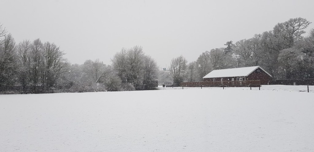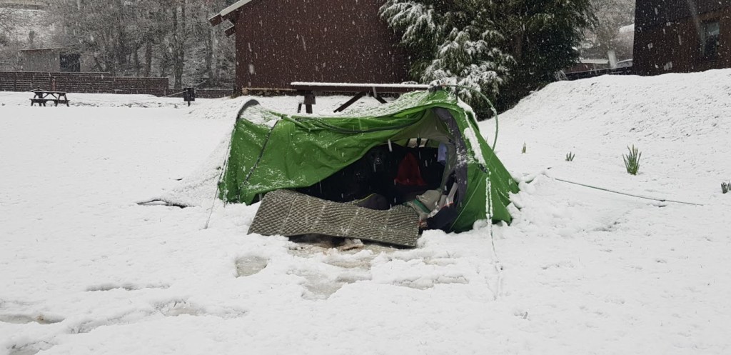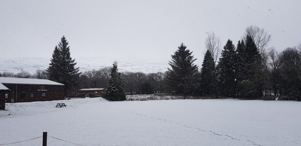 Hello again people and pooches. Joe the Cocker here again reporting on day 4 of our Great Glen Way hike. We were camping in Fort Augustus at the Loch Ness Highland Resort campsite. Unbelievably, we were the only visitors to the site. All the lodges were empty and there were no motorhomes, caravans or other campers. The site wasn’t officially open until the following week so we had the place to ourselves. My dad had loved the heated shower block and the heated laundry room. The lady working on the reception desk had kindly put his powerbank on charge overnight. When we went to sleep the temperature had dropped to near zero Celsius but, it was dry with only a slight breeze. We were snug in our tent with plenty of extra layers because the car was parked on site with our extra gear in it. So, we hoped for a comfortable night. It did rain slightly during the early night but, at 6:30 am the ‘rain’ seemed to be falling more softly. My dad poked his head out of the tent door and discovered that it had started to snow. The snow was sticking to the ground but, it was wet and slushy. We snuggled up closely and lay in our sleeping bags for a while not wanting to get up until the snow eased off or even stopped completely. About half an hour later we realised that the snow was heavier than earlier and was starting to weigh heavy on the tent. My dad knocked some of it off the roof of the tent as the roof was starting to dip. It wasn’t long before the roof of the tent was almost touching our faces. It was time to get up. To our surprise the weight of the snow had almost flattened our tent. A good three inches of snow had fallen in the last 45 minutes. We needed to pack our stuff up quickly. This wasn’t forecast!