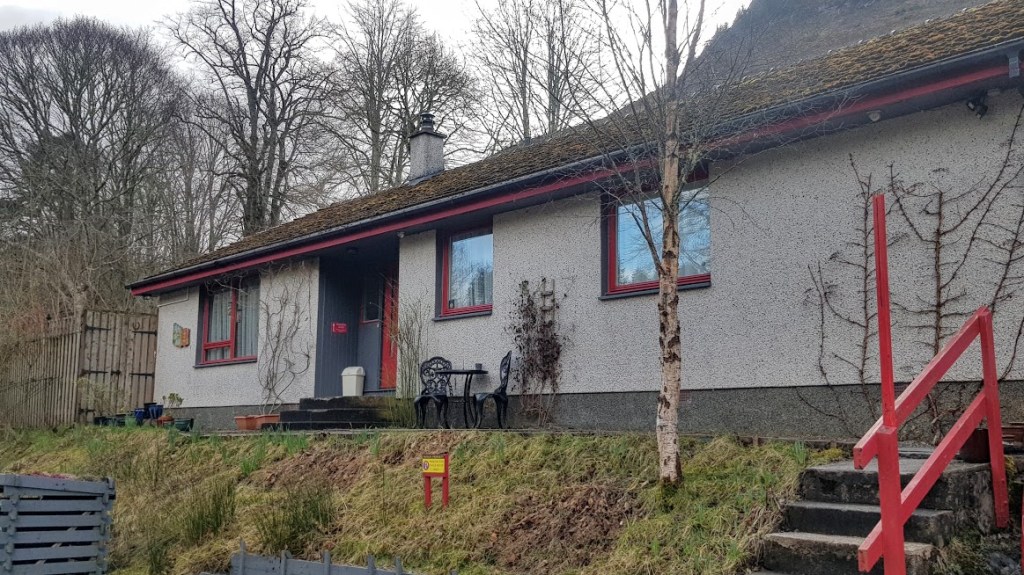 He said that we should try for somewhere in a different village. He found a dog friendly café, on-line, in Invermoriston. So, after phoning them to check that they were open we received an encouraging invitation to visit them. We drove the short distance to the Glen Rowan café and were warmly welcomed by the two young ladies that ran the place. I was fussed over and made to feel very much at home while my dad filled his face with a hearty Scottish breakfast and a couple of cups of delicious coffee. While we were there a family of Inuit Native Americans arrived, touring from Alaska. They were describing how their village of 350 inhabitants, which is north of the Atctic Circle, could only be reached by seaplane or boat. Deep snow and enduring incredibly low temperatures were a way of life for them. It made us realise that the weather that we were experiencing was nothing to them. The café owners asked my dad what our plans were for the day and he explained about the wet tent and sleeping bags and that we were looking for a camping pod for the night to dry everything and to have a comfortable sleep. They asked if we were interested in a self-catering apartment in a nearby cottage owned by a friend of theirs. My dad seemed to be keen on the idea and the price was in our budget range so, he said yes.