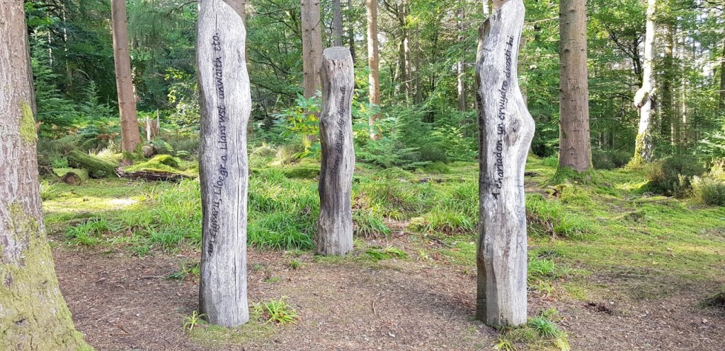 We eventually came across a gap in the trees, overlooking Llanrwst, with three eight foot sculptures, carved by Mari Gwent from old oak trees. A Welsh language poem and the lyrics to a song about Llanrwst are carved into the tree trunks. It was a magical spot made even more atmospheric by the sound of the music faintly drifting along the valley. We discovered later that the music was coming from Snowdonfest in Gwydir Park in Llanrwst.