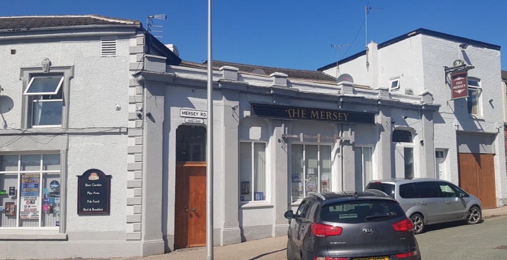 There are a couple of fenced greens along the promenade with one housing a statue bust commemorating the achievements of John Hutchinson, the chemist and factory owner. Another spot for a pee, methinks. At the end of the promenade we came to the Mersey Hotel, previously known as the Boat House. It is known locally as the Snig, after the eels caught and consumed in the area. It’s a popular place, with a large outdoor area used for barbeques and small concerts, in better times.