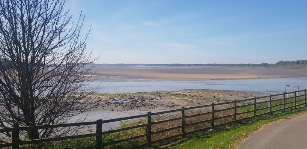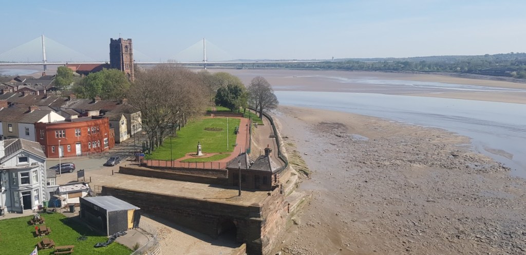 We walked along the footpath that took us onto Spike Island. The island is an area of reclaimed land forming meadows with copses of trees along the shore of the Mersey Estuary. Sections of the Trans-Pennine Trail and the Mersey Way pass through the parkland. It is hard to believe that this spot was the southernmost boundary of Danelaw during the Viking occupation. Just over the river, in Runcorn, the Vikings didn’t manage to penetrate the country. Just off the sandy embankment the wreck of the Eustace Carey Mersey flat barge was peeping through the mud of the estuary. Spike Island was the venue of the legendary Stone Roses concert 30 years ago this year and a tribute concert was planned for next month to celebrate it. This has now been moved to later in the year and will hopefully take place. As we walked around the island we could see evidence of its industrial past with the odd section of foundations showing through the grass. Nowadays, it is a haven for joggers, cyclists and dog walkers.