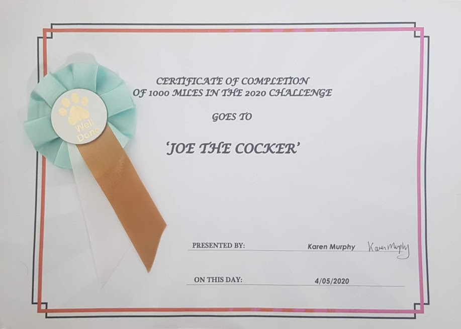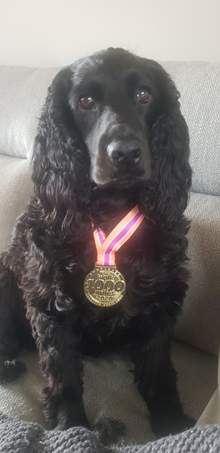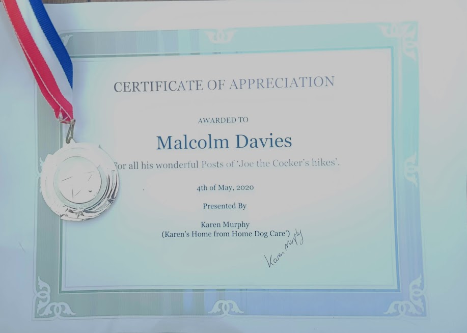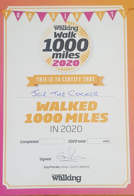 Hello people and pooches. Joe the Cocker here. The hiking that we have been doing lately has been very limited. We have been following the government guidelines and walking from our front door and staying local. Hopefully, this will change shortly and we can venture further afield. Until then our blogs will be limited. On saying that, we have had an eventful couple of weeks. We passed the 1000 mile mark for the year. My human’s t-shirt and beanie has arrived. My Country Walking Magazine 1000 mile medal has been delivered. Also, we have received medals and certificates from Karen, one of my avid followers. We also posted our photograph on Facebook celebrating our 1000 miles and received almost 1000 ‘likes’ and hundreds of encouraging comments.