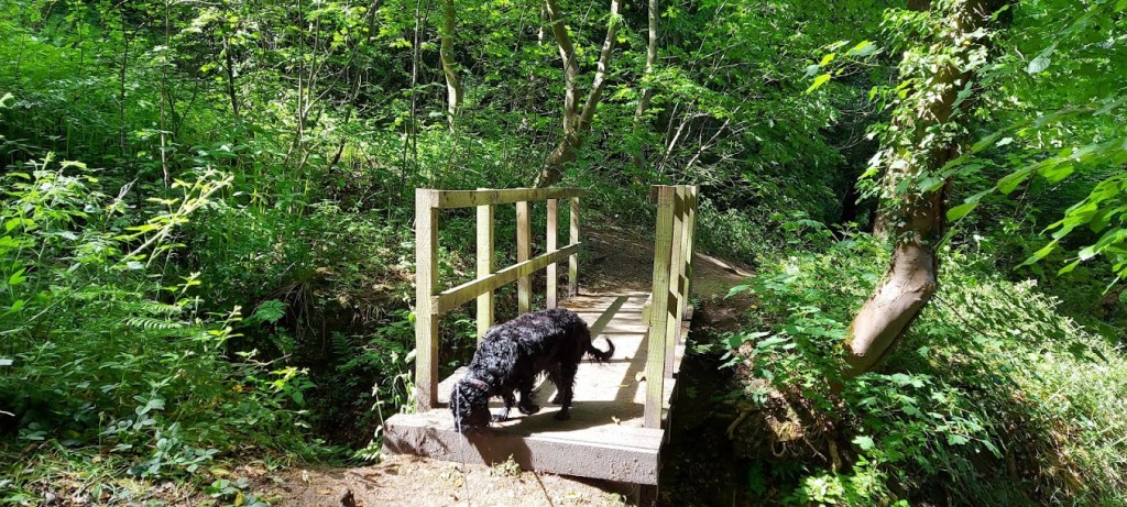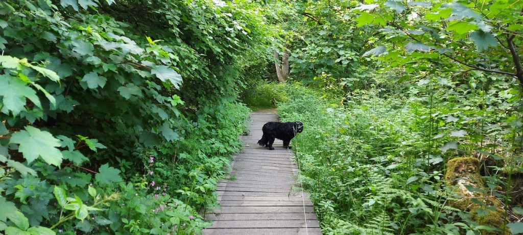 He spotted that there are some walks waymarked in local woods nearby called the Petal Walks. He decided that we should walk one of them, the one in Owley Wood. The ‘semi-natural’ woodland area is on the banks of the River Weaver so, I might get the opportunity to take a cooling dip in the water. Sure enough, the woods provided some shade while the sandy paths dropped down to the banks of the river. A long stretch of the walk is along a boardwalk that takes you through the ash, oak and sycamore trees with the odd birch and sweet chestnut. The banks of the river are lined with reeds with the odd spring leading to the river. I managed to find a shallow area that I could paddle in, still attached to my lead in case I swam out too far. I think that my dad needs to have a bit of trust in me and let me have a good swim around. He is like an old mother hen at times. I managed to get my dip in the water so, I can’t complain.