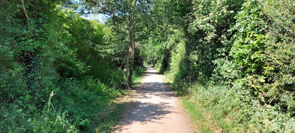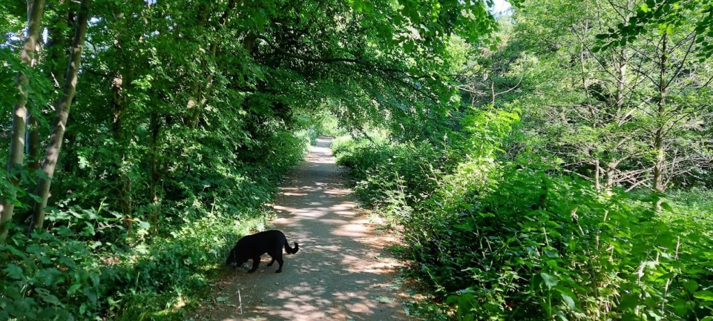 The road soon became a rough track, with arable farmland on either side, lined by large hedgerows. We managed to find some shade from the hot sun as we walked along the lane. We followed the lane as it turned left until we came to a familiar building. We had reached Catsclough Crossing, which is where we joined the Whitegate Way, that we had hiked a few times in the past. The shade from the trees lining this section of the Whitegate Way was a relief as the day was warming up. It was past midday and my dad was keen for us to get back to the car. We stopped a few times while he gave me water and checked my paws.