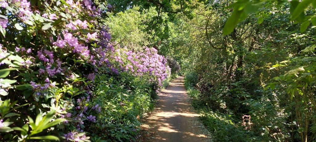 After passing the abbey we continued along Vale Royal Drive which was by now a rough track again. The River Weaver was visible at times through gaps in the trees. We entered Vale Royal Wood as we started to see more people walking in the relative shade of the oaks and beech trees. It was time for me to have a run around. As long as I return to my dad when other dogs come toward us on their lead, he lets me have a free run. My dad said that he loved this area as the sun shone through the trees and rhododendrons so, we took our time as we walked.