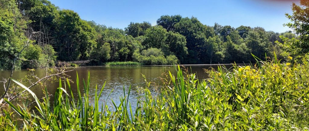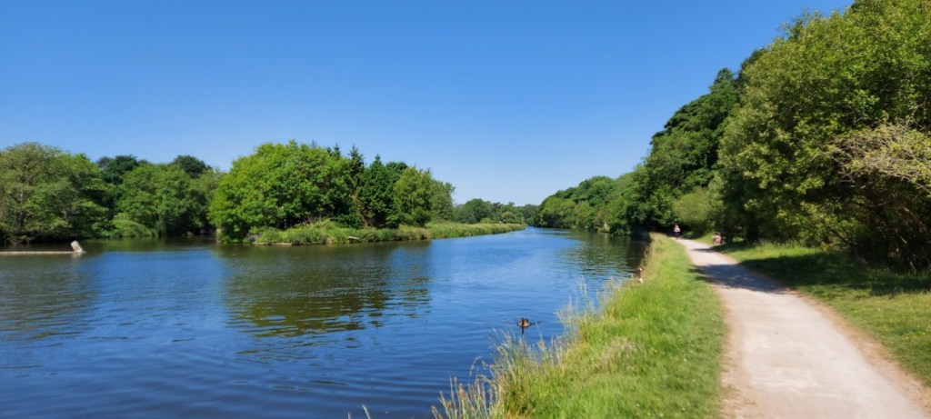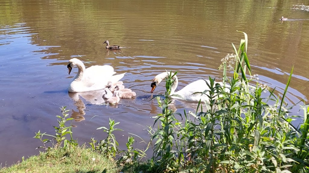 We passed quite a lot of people along this stretch of the river, some on bikes, some with dogs and families with pushchairs. I stayed off lead and walked at my dad’s side. He was so proud of me and gave me plenty of praise. The path was quite narrow in places but very straight as the navigation part of the river straightened the path of the water. Ponds have formed at the side of the river where ducks and swans were swimming on the surface and carp were visible beneath. We passed mother and father swan with their cygnets, close to the bank. Even though the adults were hissing as me, I sat quietly as my dad took a photograph.