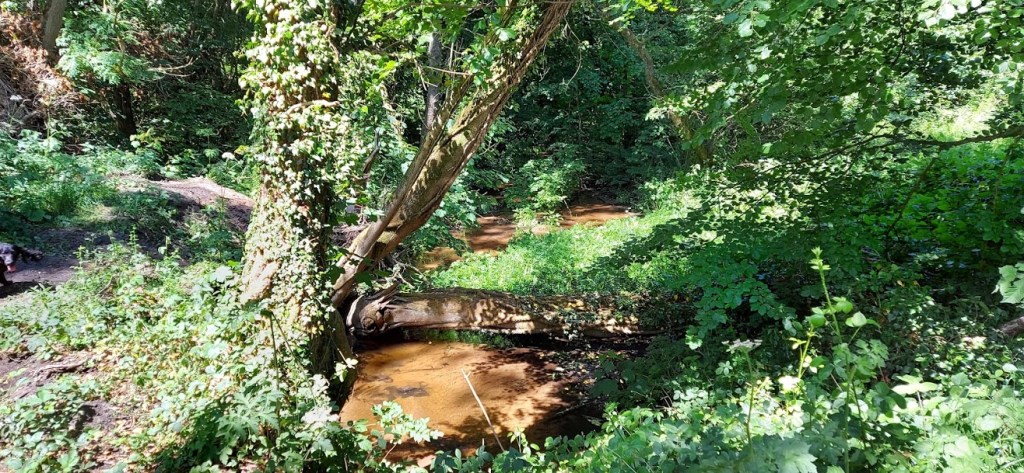Shortly, we turned right onto Grange Lane or Orange Lane as my dad thought it said on the map. He should have gone to Specsavers as the TV advert says! He checked the temperature of the road with the palm of his hand and decided that it was still cool enough for me. After we had passed a few cottages lining the lane we came to the shelter of trees as the continuation of the road became a rough track. The path ran along the densely wooded area by Pettypool Brook. I had a quick cooling dip in the brook at a clearing in the woods. It was nice to cool down but, we weren’t far from the car at this point of our hike.