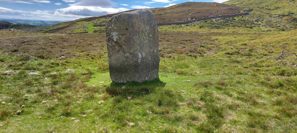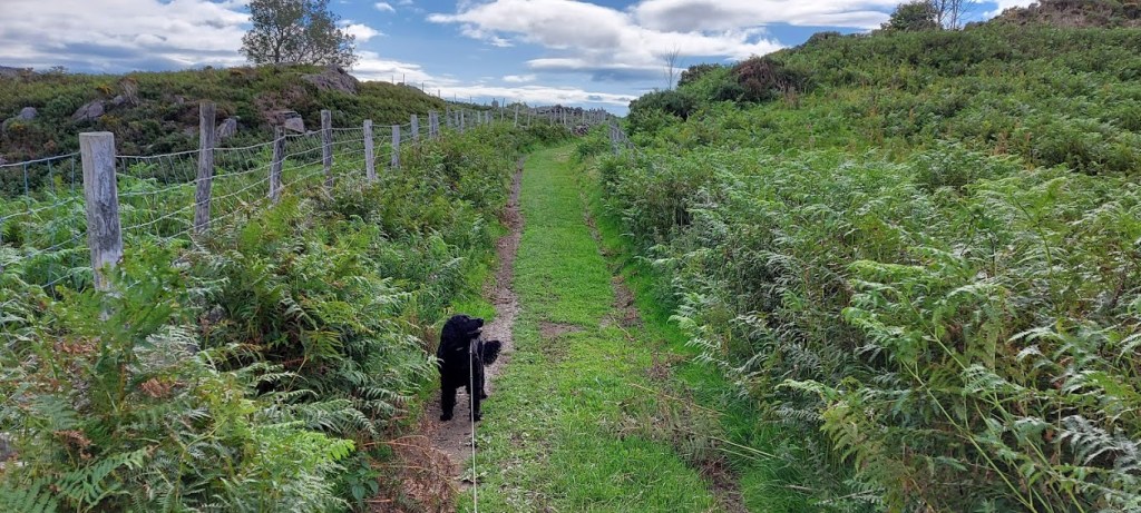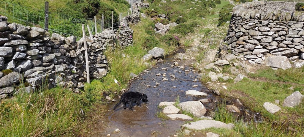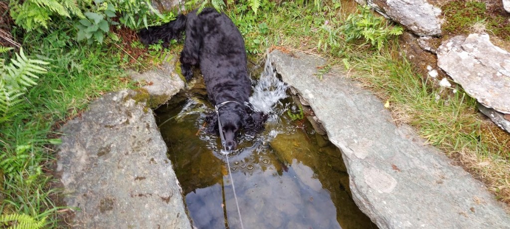 After our eventful visit to St. Celynin’s, we headed back along the track, to join the North Wales Pilgrim’s Path, in a westerly direction along a rough track. We had our first views of the Irish Sea with Conwy and its castle in the foreground. It was a warm morning with a fresh sea breeze keeping us cool but, I took every opportunity to wade and drink from the many streams, as we gradually gained elevation. We passed many sheep grazing on the hillside but, we were both surprised to meet a wild Carneddau pony with its foal, on the footpath. We walked slowly around the mother and child while I took it all in my stride. No barking and no pulling on the lead so, my human was proud of me. He said that I had come a long way since I was a crazy pup who used to chase his own shadow.