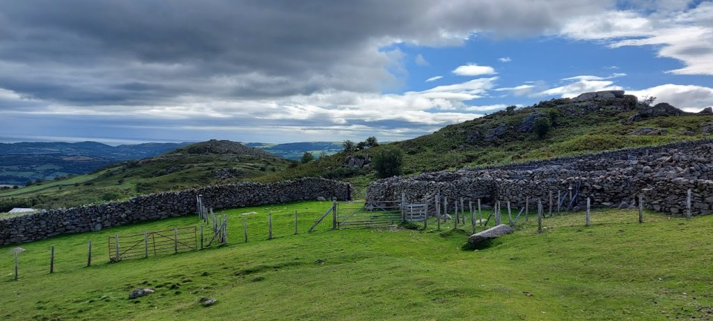 Little is known about the hillfort. It sits on a hillock overlooking the Conwy valley at around 410 metres above sea level. It is a small fort, hence its name Caer Bach. Many of the rocks from the construction are scattered around the site and the circular defensive wall and bank can be easily identified. We had the place to ourselves while my human pondered the structures history.