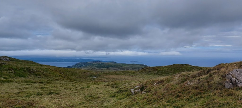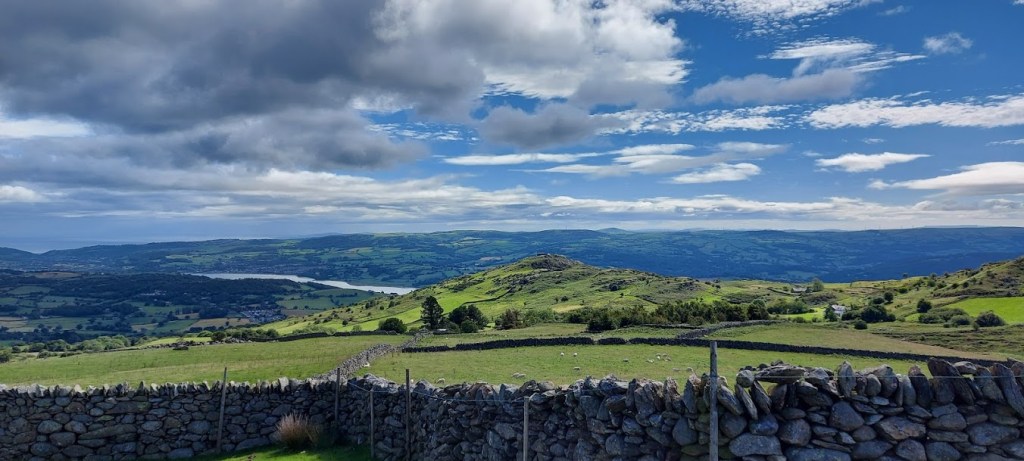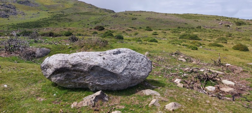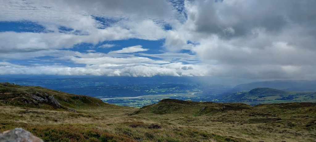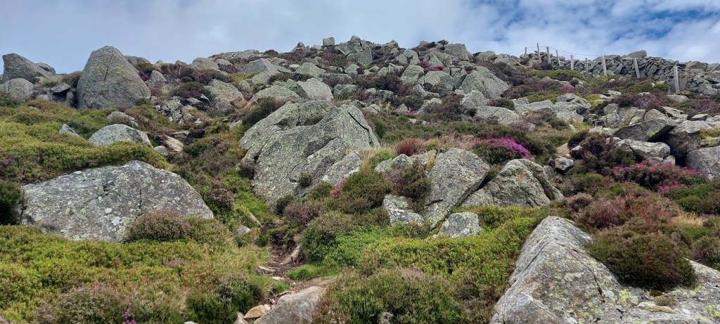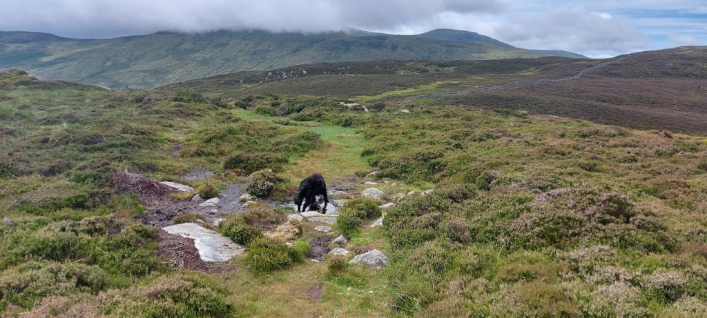 We rested for longer than usual at the summit. It was a good spot with some shelter and great views so, why should we hurry. The clouds drifted down to us for a fleeting moment but, there was no rain forecast. We left our lunch spot by walking parallel to the ridge wall and down a scramble over boulders. Well, it was a scramble for him at times because he doesn’t have four paw drive like me. I waited for him as he struggled so I received a head ruffle and a ‘good lad’ when he caught up with me.