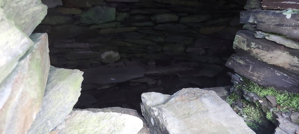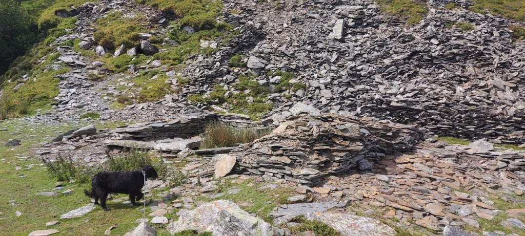 Shortly, we came to a junction with a wide track where we turned sharply left, to head toward Tal y Fan. This path was on a steady incline as we passed a standing stone and a couple of small ruined buildings. Things changed as we neared the abandoned slate quarry. The path became steeper as we passed the spoil tip on our left. We reached the flattened area on the top of the spoil tip and stood there for a few minutes as we admired the view. The caban, or workman’s hut, is still intact and with a squeeze it can be entered from a small doorway. Inside there are stone benches and a fireplace. A grim refuge for the miners but, probably a welcome shelter from the weather. We waded through the water in the entrance to the quarry or mine but, decided against going fully into the workings. There are foundations of other quarry buildings close by that the big feller insisted on investigating.
