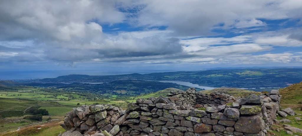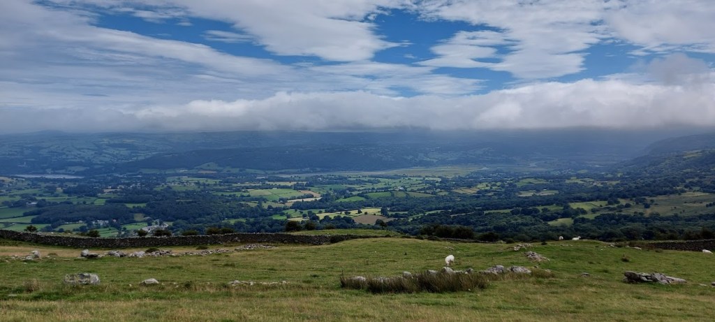 We walked for a short distance along the lane, which was part of a Roman road, until we met a track veering to the left. This path led us past lots and lots of sheep. My dad was pleased with me as I stayed on a short lead without pulling toward the sheep. Why would I? They don’t want to play, they just run away. The path followed a wall for some distance as we looked down onto the Conwy Valley. After about a mile we came to Caer Bach hillfort above us on our left. We climbed the hill to walk around the site of the fort. My dad found a boulder in the centre of the remains, in the original position of the roundhouse, to sit on while he drank more coffee and we both ate some snacks.