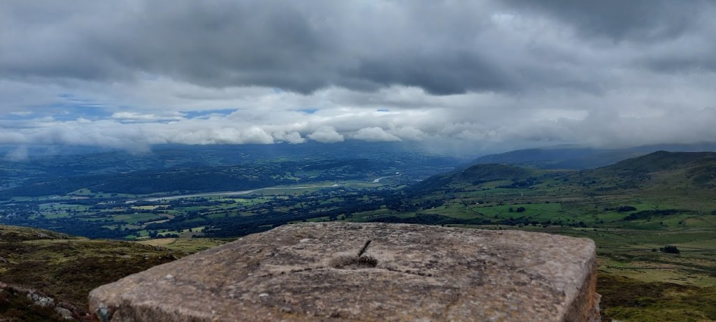 We found a way to the summit of the mountain by following an indistinct path that took us steeply from the footpath to a higher path, just short of the highest point of the mountain. We both had to scramble for a short distance. We probably could have found an easier route but, it was fun, and people had been up that way before as we could see the boot prints. It only took us a few minutes and we were at the stile on the opposite side of the wall to the trig point. I couldn’t climb the ladder stile over the wall and as we would be continuing on our hike on the side that I was on, my dad nipped over the wall to take photographs. He was only gone for a few seconds and I waited patiently. It was time for a break so, my human found a suitable rock to park his butt on in the shelter from the wind while we ate our food.