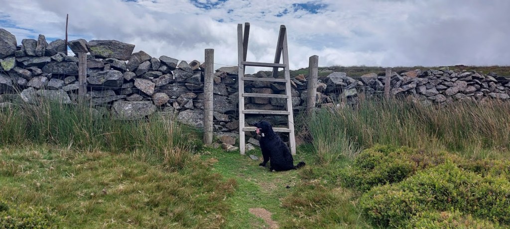 We soon came across a ladder stile over the wall that we had followed. I waited at the bottom of it knowing that I would have to be carried over it. My human lifted me up and said that I was a lump. I could see that he was struggling to carry me safely over this obstacle but, it had to be done. It was a relief when I was back on terra firma. We had survived. The path down into the valley was over firmer land than on the opposite side of the mountain. However, I could see another ladder stile looming ever closed as we headed for another large wall.