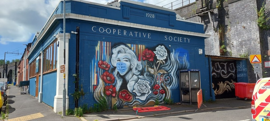 The next place to catch my dad’s eye on our walk, before we reached the old locks, was Society Ltd. The pub and microbrewery are housed in the 1928 Co-operative Society building. The amazing mural on the exterior of the building is definitely a sign of the time, with its main character wearing a facemask.