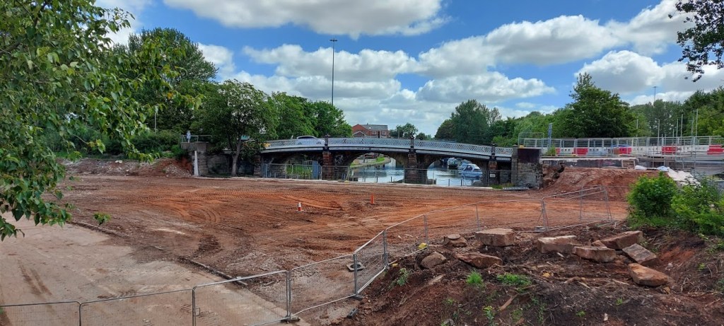 We spent a few minutes in the overgrown Entrance Lock area, before we returned to the lock area behind the Waterloo Bridge, at the back of Hankey Street. At this point the locks passed under an arch of the railway bridge. There is currently so much construction and demolition work in this area that it is difficult to imagine how the old flight of locks could be re-instated. We walked around the re-routed footpaths and crossed Waterloo Bridge. The bridge has three arches, one for the old line of locks, one for the new line the central arch led to a dry dock. The bridge had cast iron extensions added in 1886 to widen it for road traffic. It is a Grade II listed building.