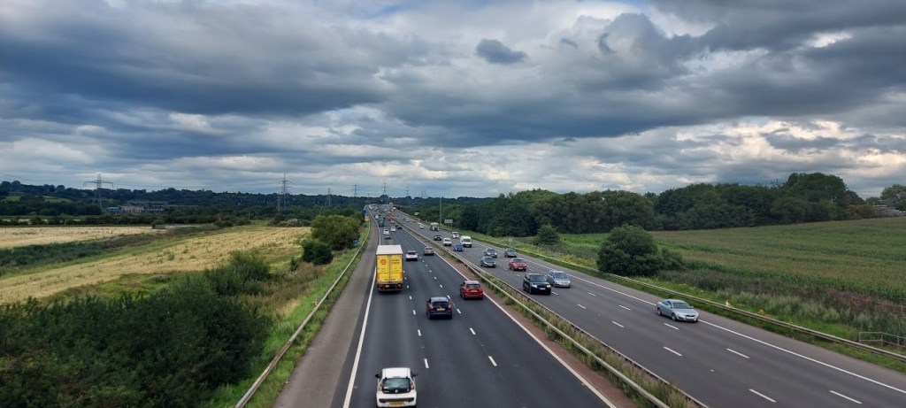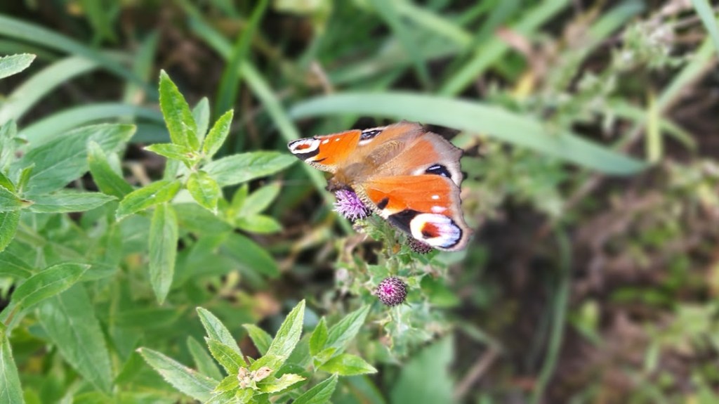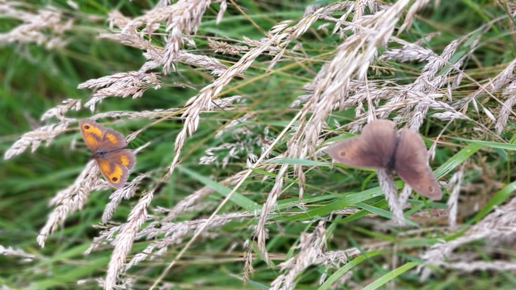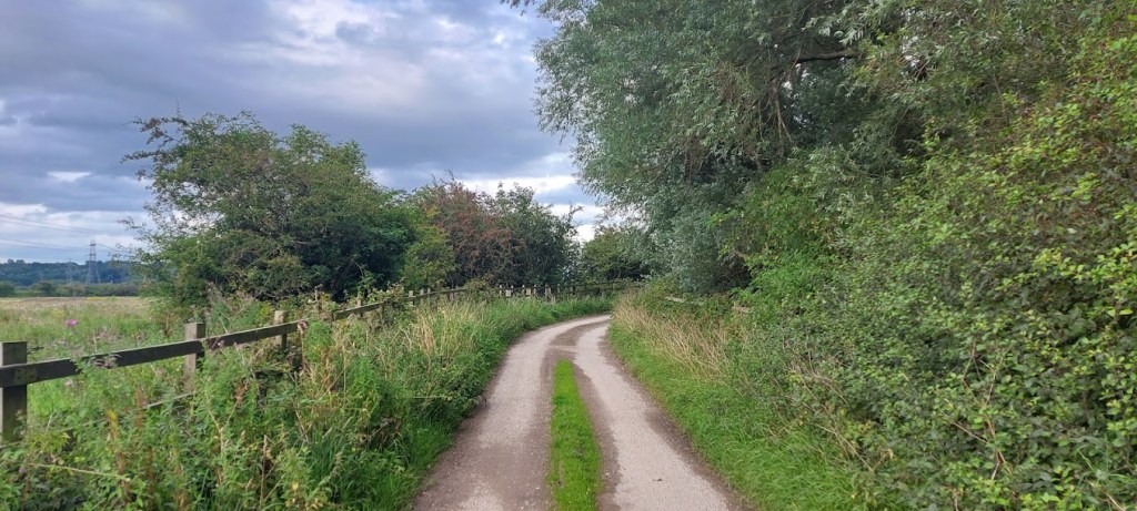 The narrow path became wider and grass covered as we followed the course of the River Weaver with the large wet area owned by Inovyn. On the shores of the river were many geese that were taunting me with their loud honking. Shortly, we moved away from the river as we passed The Lum, an area of wetland, on our right. The marshes are criss-crossed by drainage ditches and we walked along a track at the side of one. We saw bright blue dragonflies and many moths and butterflies. We followed the path as it became a rough single track road, Weaver Lane, that passed over a bridge over the M56. A puddle, the width of the road, looked like an obstacle that we would have to negotiate until my dad spotted a dry verge at the side of it. I was ready for a mad five minutes splashing in the muddy water but, Captain Sensible made me follow him on dry land.