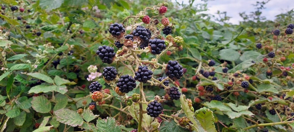 We plodded on to walk under the M56 road bridge until we came to a pond on the left. The big feller started munching on blackberries that he picked from the bushes around the pond. He started to make strange noises that must have meant that he was liking what he was eating. I noted that there were no treats for yours truly growing on the bushes. Ah well, on we went on our hike.