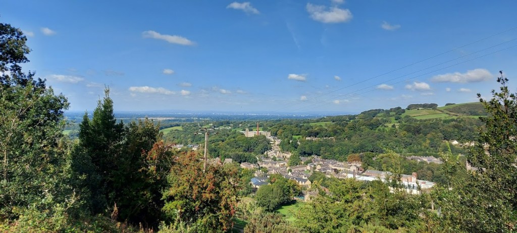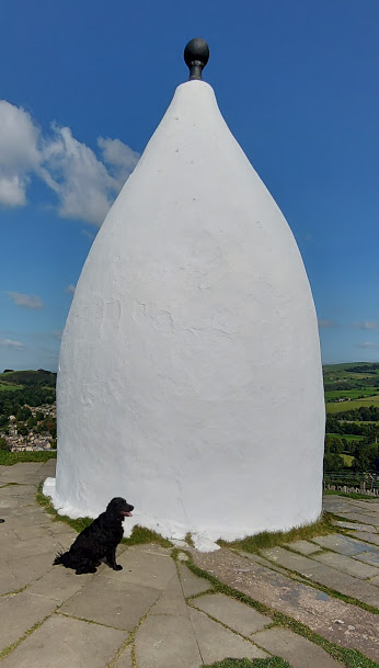 We turned back and he spotted the bridleway sign, on the opposite side of the house that we had walked past. This took us through a kissing gate, on an uphill narrow track, until we headed right up a footpath leading to White Nancy. The path was fairly steep and lined with sandstone steps in places. We stopped to turn around while he admired the view over Bollington, with its old mill buildings. Manchester could be seen in the distance with its high-rise buildings such as the Hilton Hotel. After a short stretch of walking up a grassy slope, we made it to White Nancy.