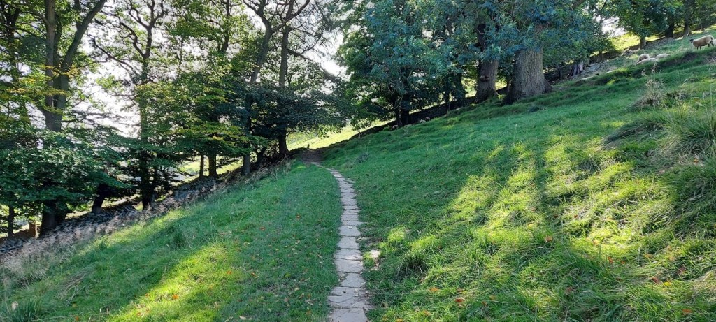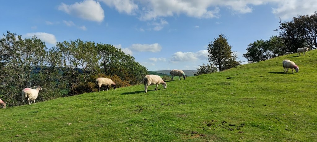 The footpath wound its way along the side of the hill, passing through sheep grazing pastures. We stopped for a while, as the big feller complained about his poorly knee. We shared his Coronation Chicken sandwiches and drank a bottle of water. We were entertained by a sparrowhawk, that kept hovering and then swooping for its prey, in the grasses. It failed on three occasions and then appeared to fly away with a fieldmouse or vole. Give me a sausage butty any day of the week!