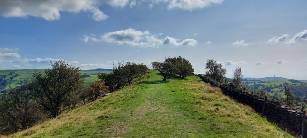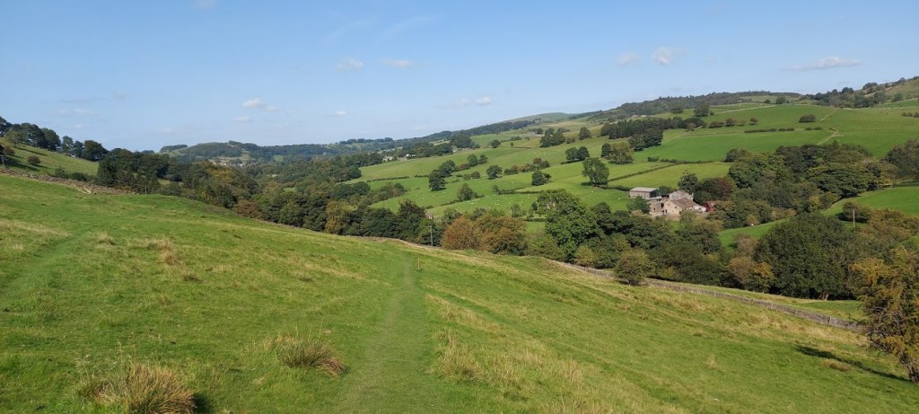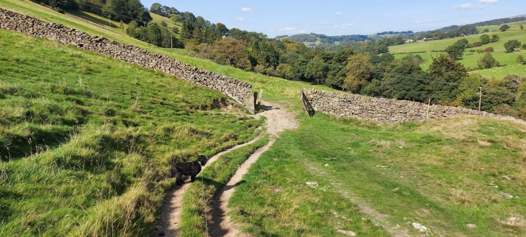 The ridge walk is part of the Gritstone Trail, that runs for 35 miles from Disley to Kidsgrove and is on our ‘to do’ list. The surface of the footpath changes from a narrow gritstone to grass and to a wider compacted finish as we walked. A short incline on a grassy slope, with sheep grazing, took us to the trig point on the top of the hill. From here we passed through another kissing gate before we started our descent from the hill. The footpath dropped down the gritstone hill, steeply at first and then gradually until we met a sharp left turn that would take us along the valley, formed by the River Dean.