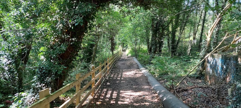 We crossed over Beechwood Avenue, and walked along the disused stretch of Wood Lane, before we turned left, along the footpath into the Beechwood housing estate. After a short walk along the tarmac path, and past a small pond, we turned into the woodland of Floodbrook Clough. The footpath has recently been fenced off from the steep drop into the clough. The path is always muddy in some sections and to avoid some of the worst sections my dad clambered over the exposed tree roots. It is always fun watching him slip on the roots. After this short length of path, the rest of the walk is along laid footpaths at the side of the houses. We stopped to look down into the steep sided woodland and wished that there was a path within the trees. People have made YouTube videos as they unofficially walk through the clough and into the tunnel that leads through some of the valley.