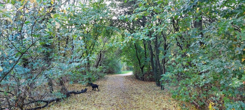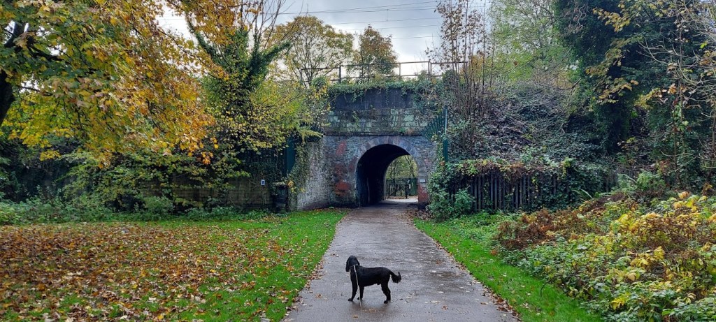 The final quadrant was accessed after a few hundred yards of pavement walking along Pottery Lane and opposite the car park that we had left the car in. The quadrant, known as Pottery Fields, was once the home to two collieries, Carr’s and Prescot. It is a large open space with one main footpath and therefore another excuse for me to run free collecting the odd stick and munching on it. We walked around the meadow and left the main path to walk through the trees along a grassy footpath. Part of this area is reclaimed landfill and wet under paw. This didn’t bother me in the slightest as I had more zoomie moments and chased sticks that the big feller through for me. He wanted me to bring them back to him after I had run for them. Why? If he wanted that particular stick, he could go ‘fetch’ himself. He has got a nerve!