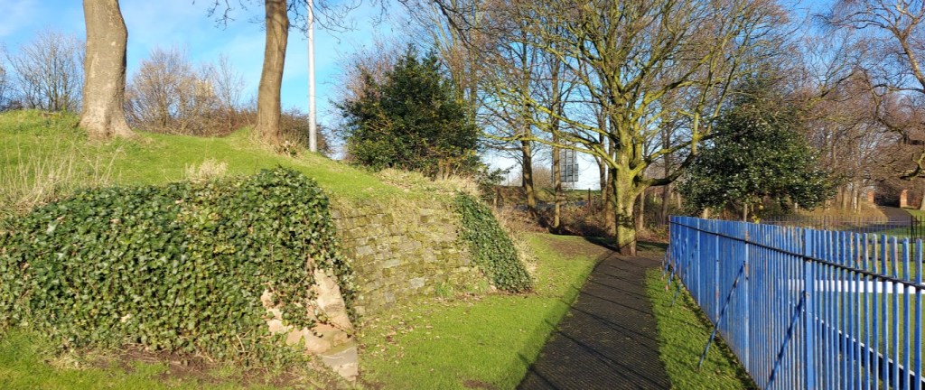 2 The second place that we visited is a short length of curved stone wall. It is approximately 6 feet tall and 12 feet long with a grass bank on the top. It was originally the exterior wall of public toilets in Rock Park. It has been backfilled and nowadays doesn’t seem to serve any purpose other than its aesthetic value.