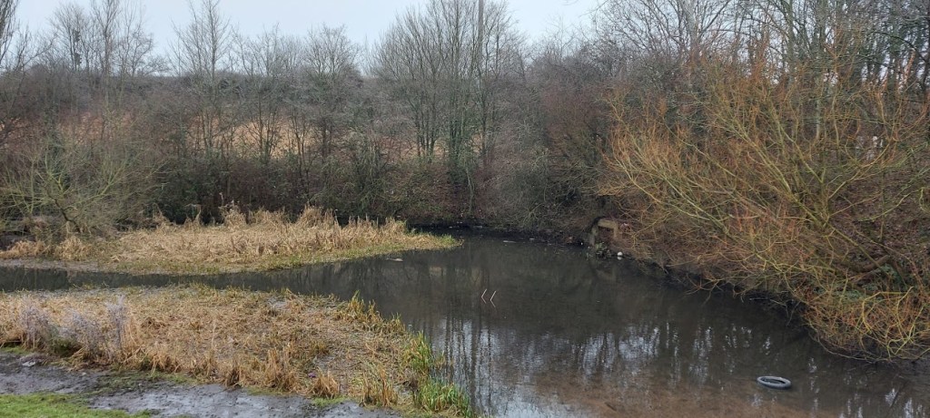 We left the house on a cold winter morning with me in my fleece suit and my human dressed as if he was about to walk to the North Pole. The big feller nearly landed on his backside on more than one occasion as he slipped on the frozen pavement. I held back the laughter, mainly because I can’t physically laugh but, also because he didn’t seem to see the funny side of his antics. We crossed over Heath Road by the Union Tavern into the grassy area behind the hedgerow. I was allowed a few minutes freedom off-lead while I had an attack of the zoomies. The small pond in the dip is all that is left of Big Pool.
