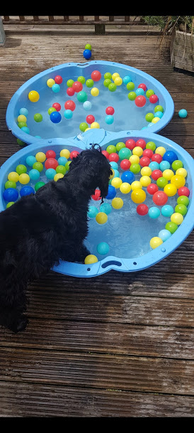 The water baby loves his paddling pool during warm weather. He loves nothing more than to walk outside, lie down in his pool, then come back in causing mayhem as he shakes himself. He spends plenty of time ducking for the plastic balls.