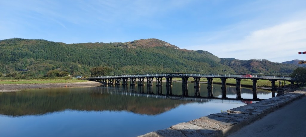 The prominent structure in the hamlet is the Grade II Listed wooden tollbridge that crosses the Afon Mawddach. The bridge was constructed in 1879 to replace the ferry crossing at the same point. It can only take light vehicles under 1.5 tonnes. Some two hundred vehicles cross the bridge each day and pay 80p each with a fee of 40p per pedestrian. We made a detour from the trail to cross the bridge and to return a few minutes later. Our toll was offered back to us at the tollbooth but, Mr. Generosity, declined!