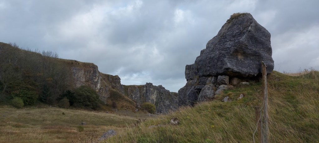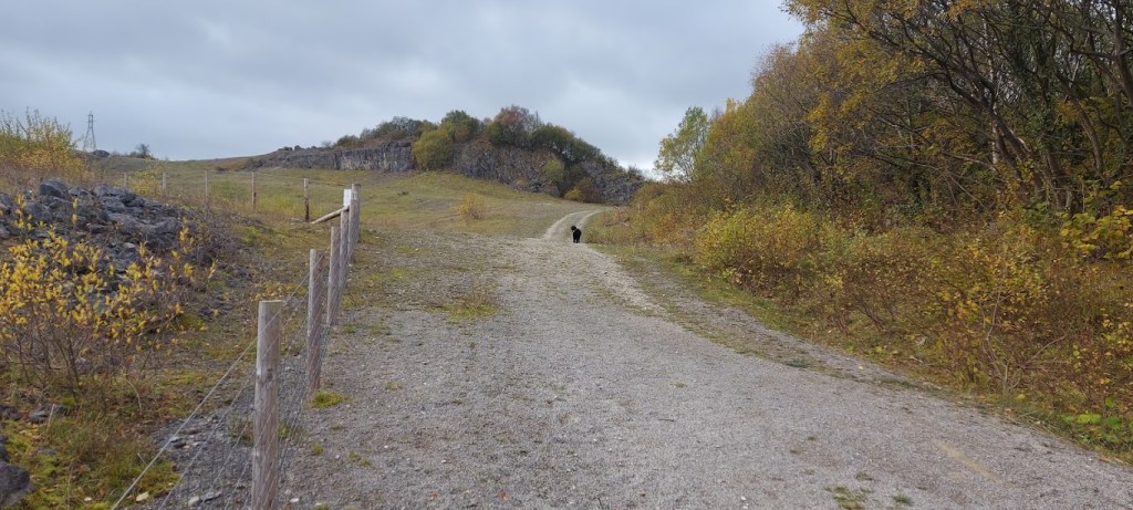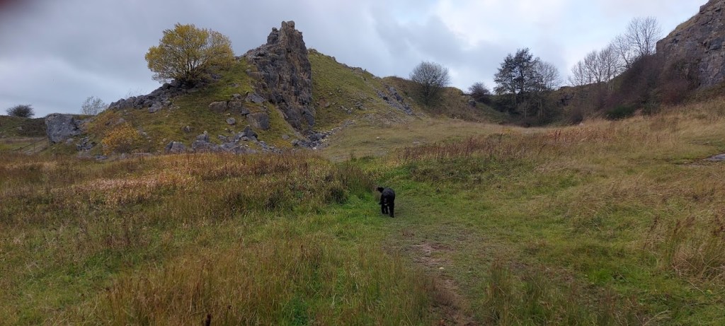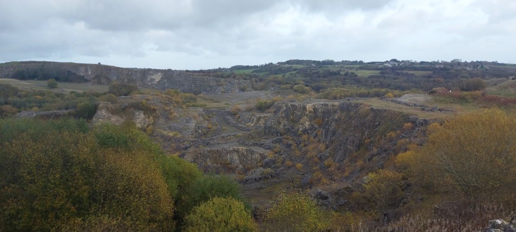 Large areas of the vast quarry were fenced off due to the danger of falling and erosion, but a large flattish area opened up before us sheltered by large limestone cliffs. We didn’t follow any particular route as we investigated the area. We followed a path that circled a fenced off quarry, to the edge of the moors. Tempted to hike across the open land to Minera and Esclusham Mountains, we decided to leave for another time.