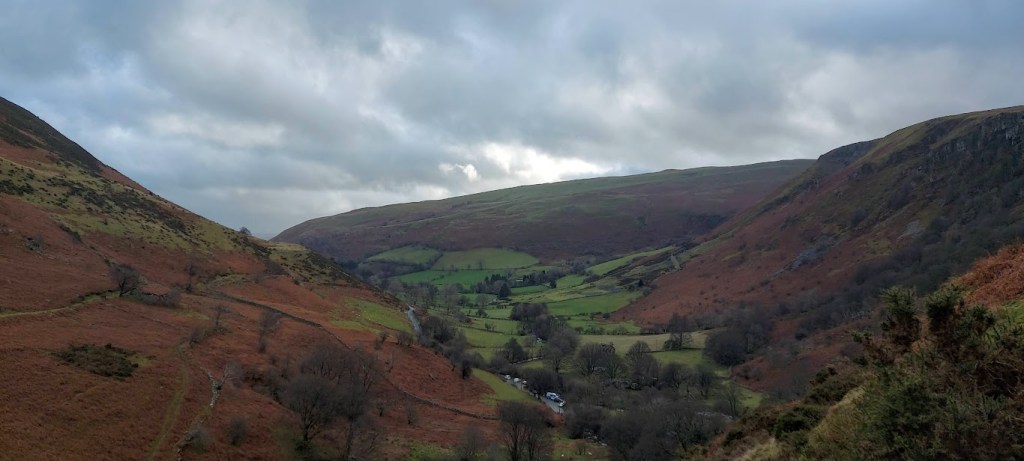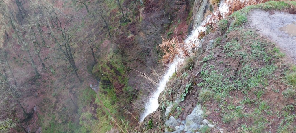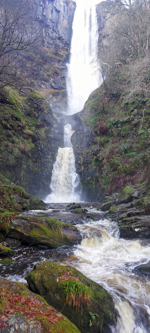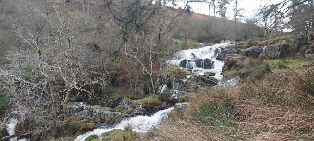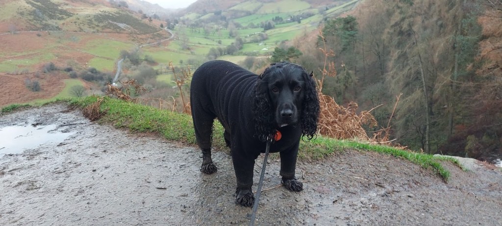 Hello again people and pooches. Joe the Cocker here. Me and my human personal assistant have just returned from our New Year’s Eve walk. We were going to hike to the summit of Moel Famau for the midnight celebrations, but after researching it we discovered that some people set off fireworks as the new year arrives. I really don’t like fireworks, like a lot of pooches, so we swerved that one. Instead, we drove the short-ish distance to Llanrhaeadr-ym-Mochnant in the Berwyn Mountains. It is a popular visitor attraction, but we hoped that there would not be the usual weekend throngs of sightseers as the weather was wet and windy and people would be busy with their New Year celebration plans. We were right, it wasn’t crowded. The three mile long single track road from the village was completely devoid of those awkward moments when cars travelling in opposite directions meet at the narrowest sections. The car park charge was as steep as the surrounding footpaths at a fiver. There is an unofficial parking spot at the roadside just prior to the official car park, but, hey-ho, the fees help to maintain the area.