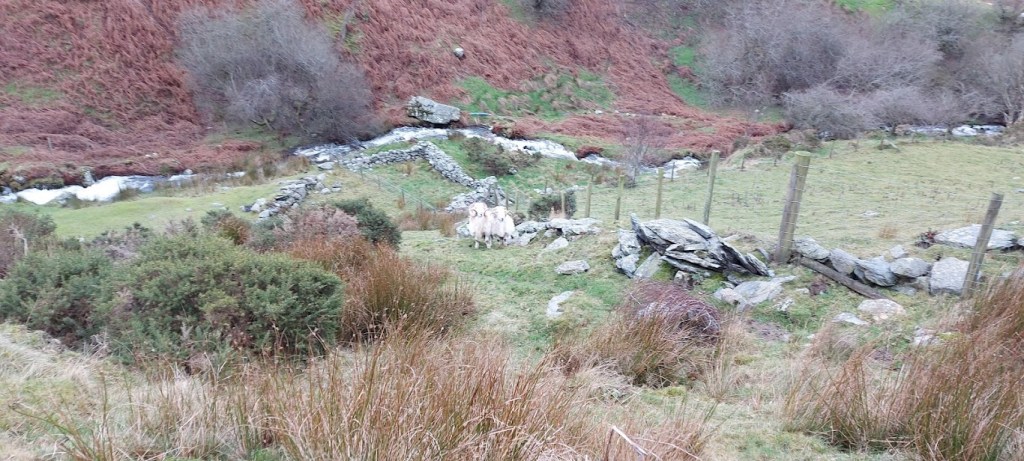 After we had spent, what felt like a lifetime, at the base of the falls, we set off on the clamber up to the top of the waterfall. We had to make a detour back to the car while my human picked up his trekking poles. The hike to the top only takes thirty minutes, but it is quite steep. We passed through a gate and through some Cocker Spaniel knee-deep mud onto a stony and muddy pawpath. Shortly, the path became less muddy and easy to walk on. I was still on my lead while we passed some grazing sheep on the hillside.