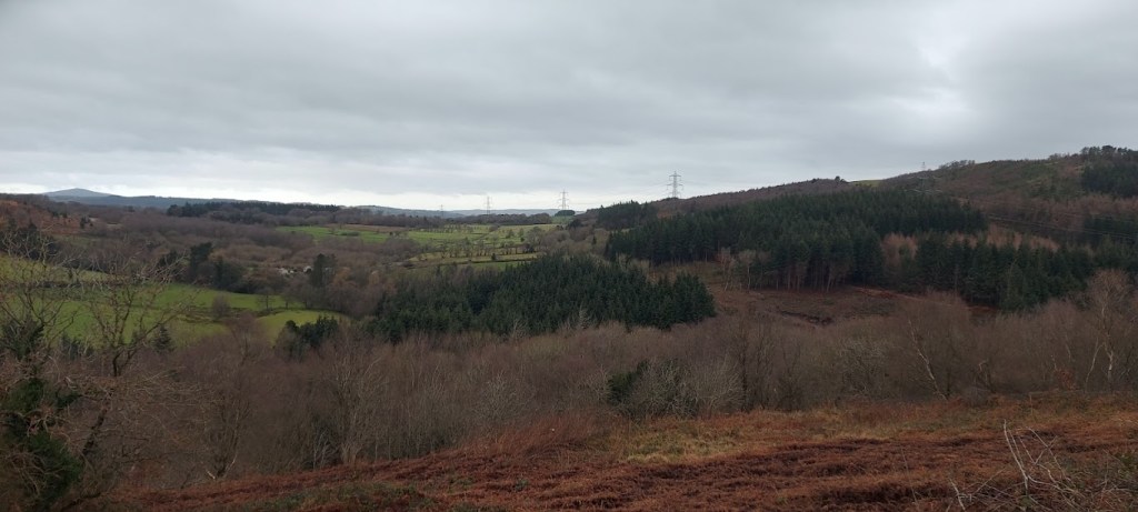 Hello again people and pooches. Joe the Cocker here. Me and my human did this walk in early December 2020 on a wet Sunday morning. The rain had stopped early in the morning so we thought that we would investigate an area that was new to us. After a short drive to the village of Bwlchgwyn, which claims to be the highest village in Wales, we parked up at the viewpoint next to the war memorial.