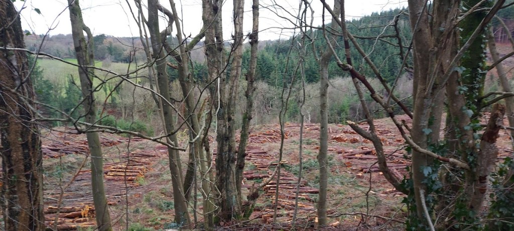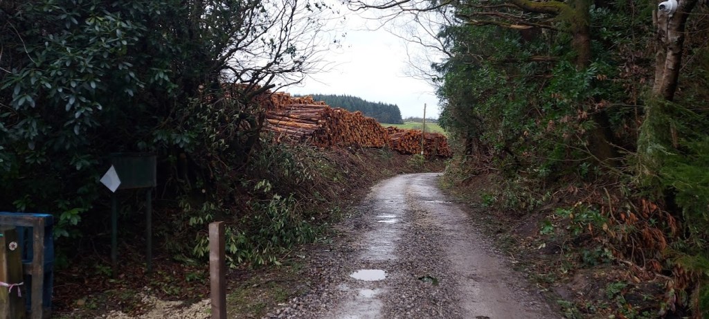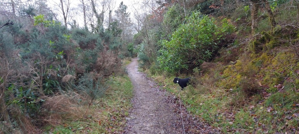 After a few minutes we left the tarmac to descend gradually down a footpath amongst the trees. Large swathes of forest had been felled and the trees stacked in piles by the forest tracks. Quite a few trees had also fallen across the path during the recent high winds. They created a fun obstacle course for me as I jumped over and ducked under the fallen branches. My human, however, managed to bang his head on one low branch. He has a terrible potty mouth at times!